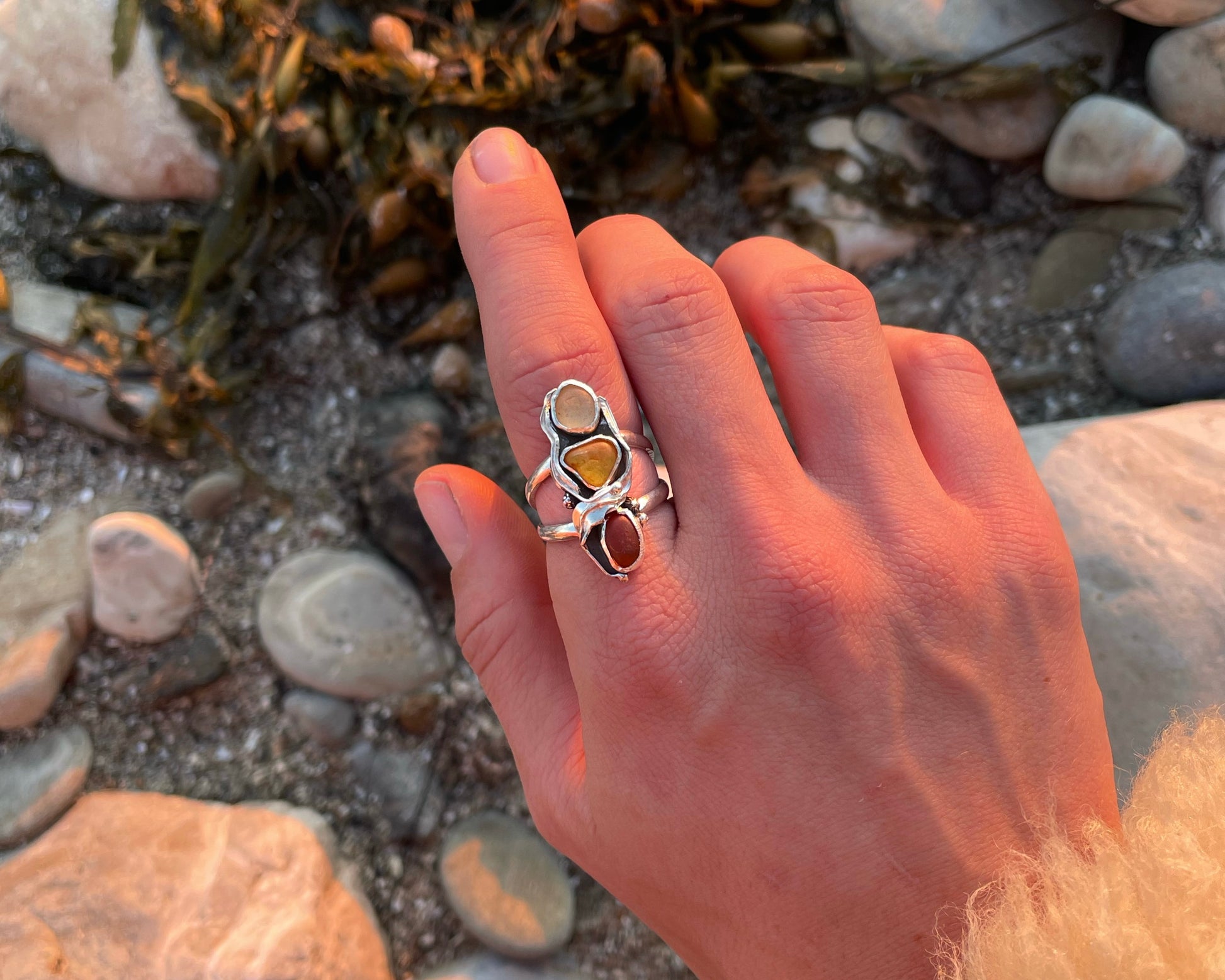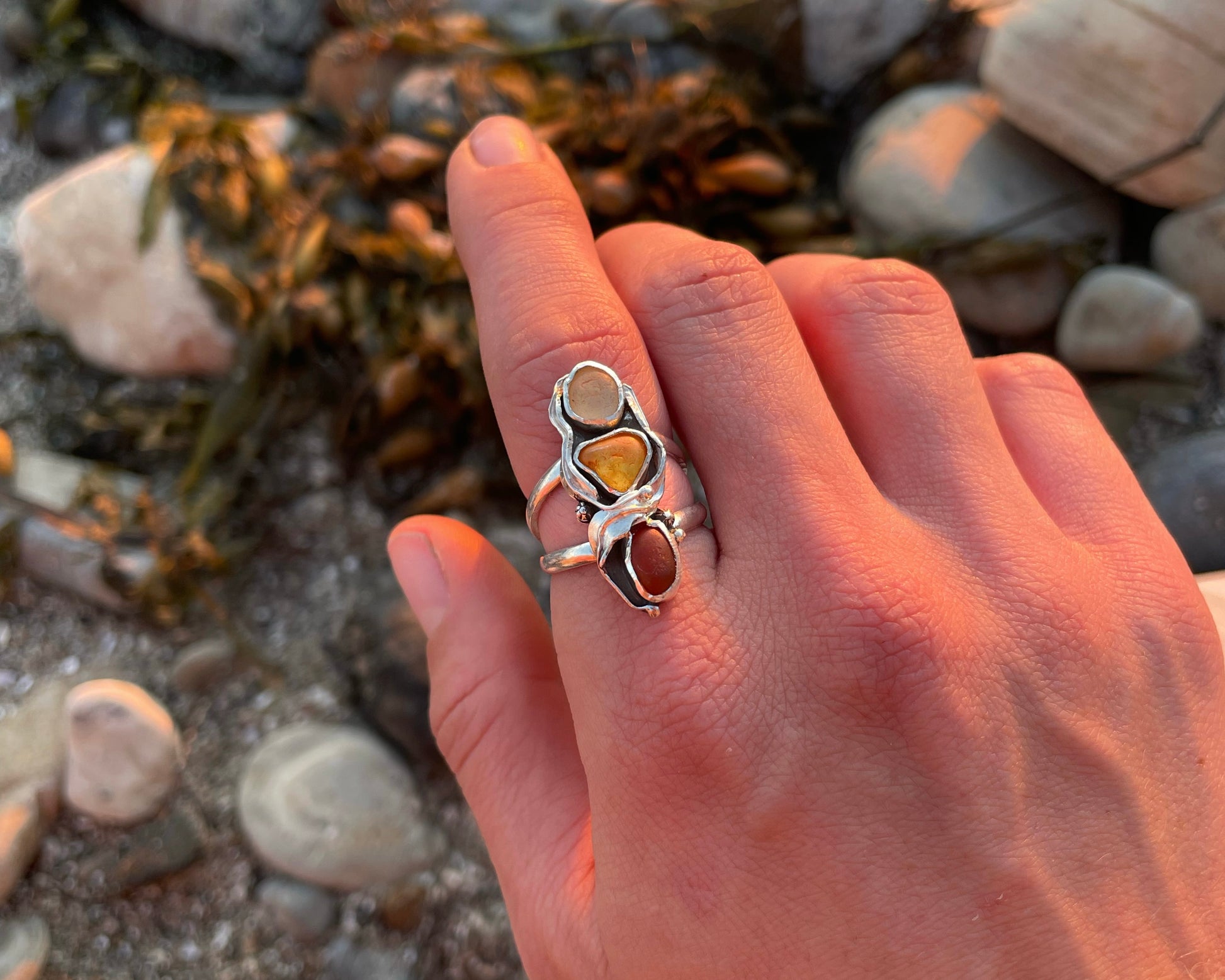 Ombre brown seaglass, including rare light amber and reddish amber, surrounded by two pieces of twisting, drifting "kelp" and hidden "barnacles."