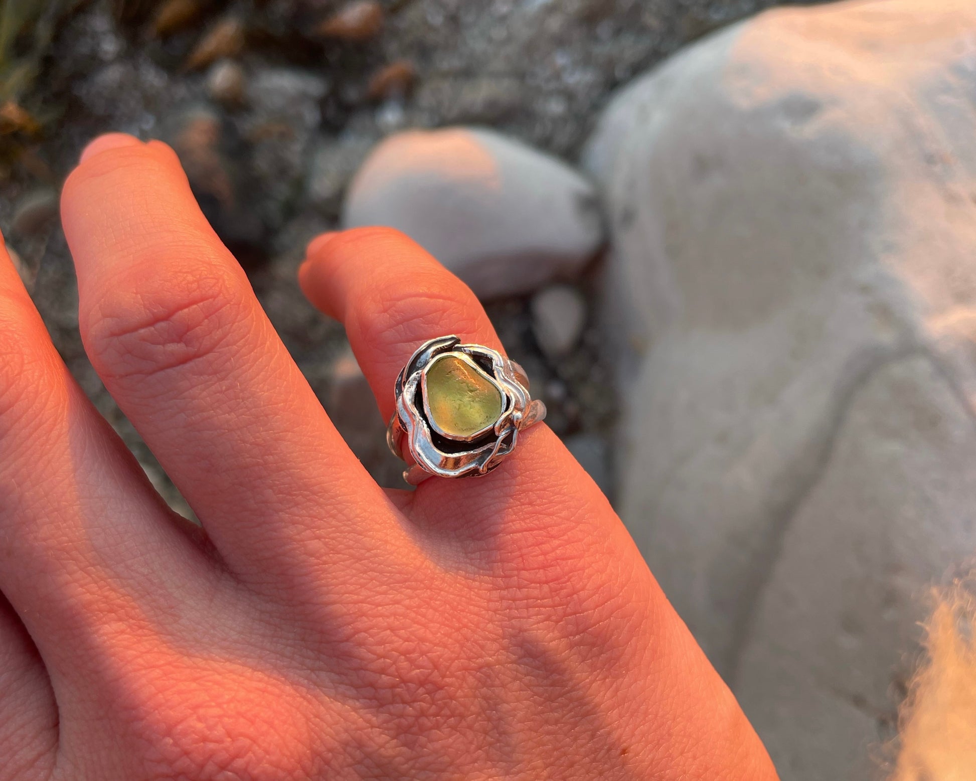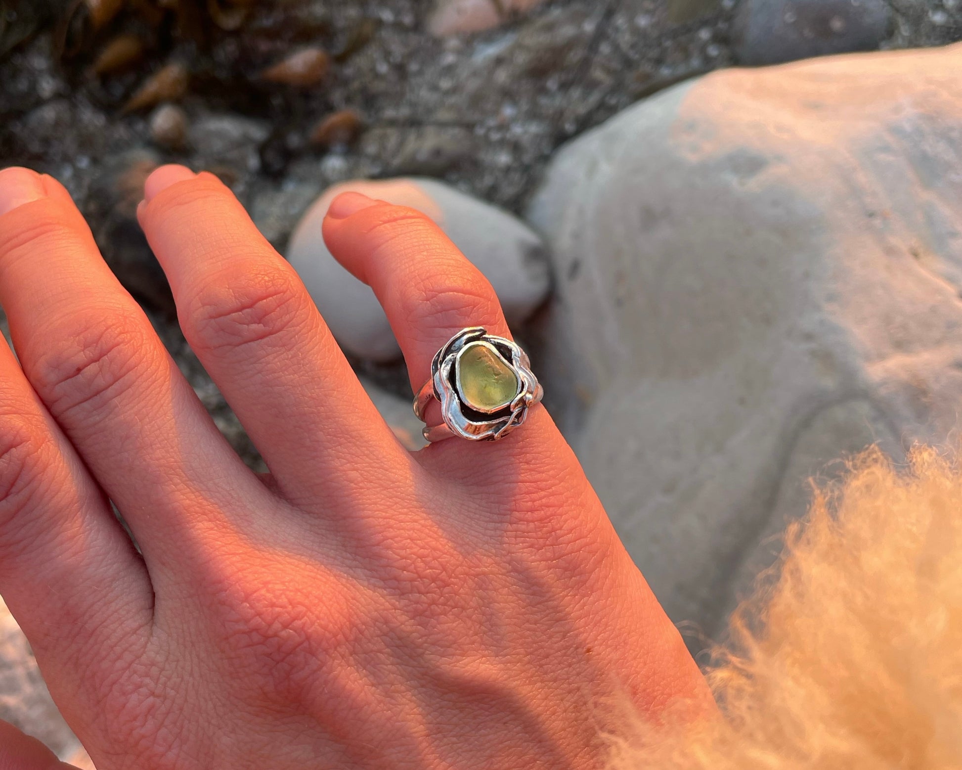 Rare sea foam green seaglass is surrounded by swirling, drifting "kelp," reminiscent of a tide pool.