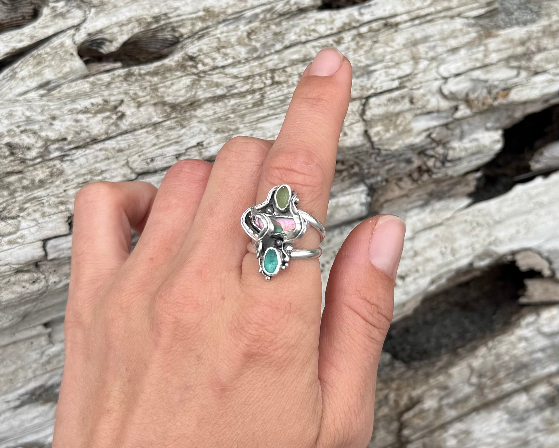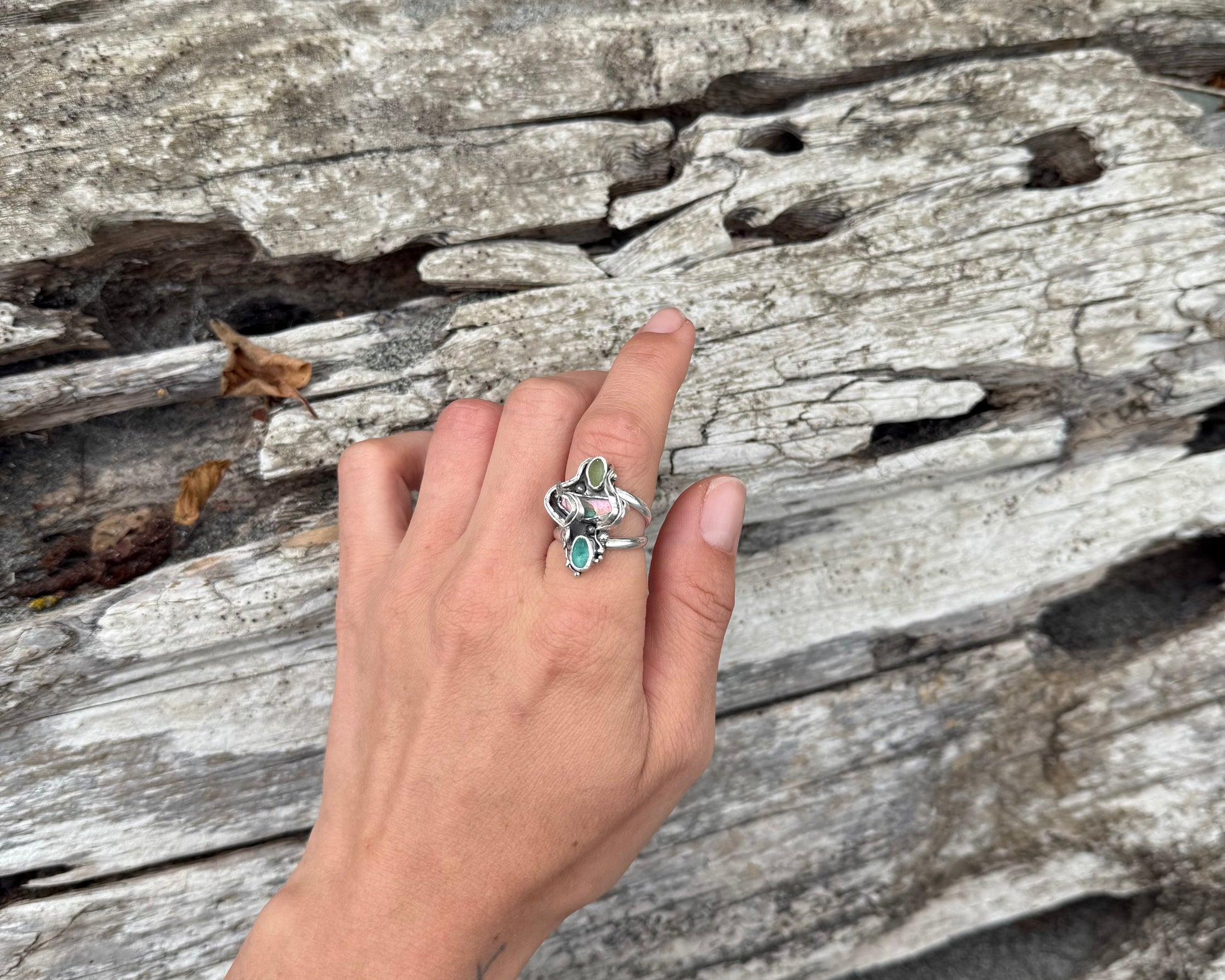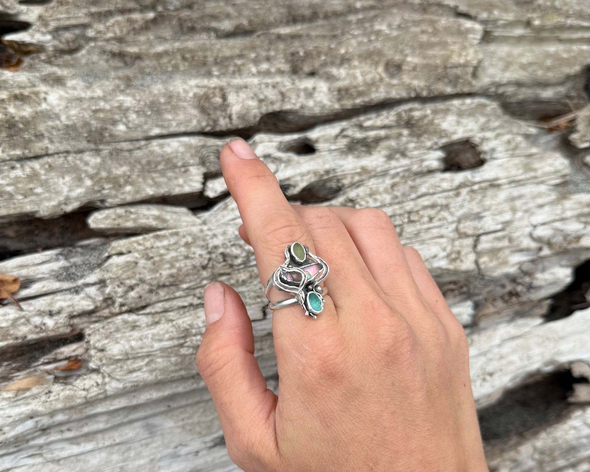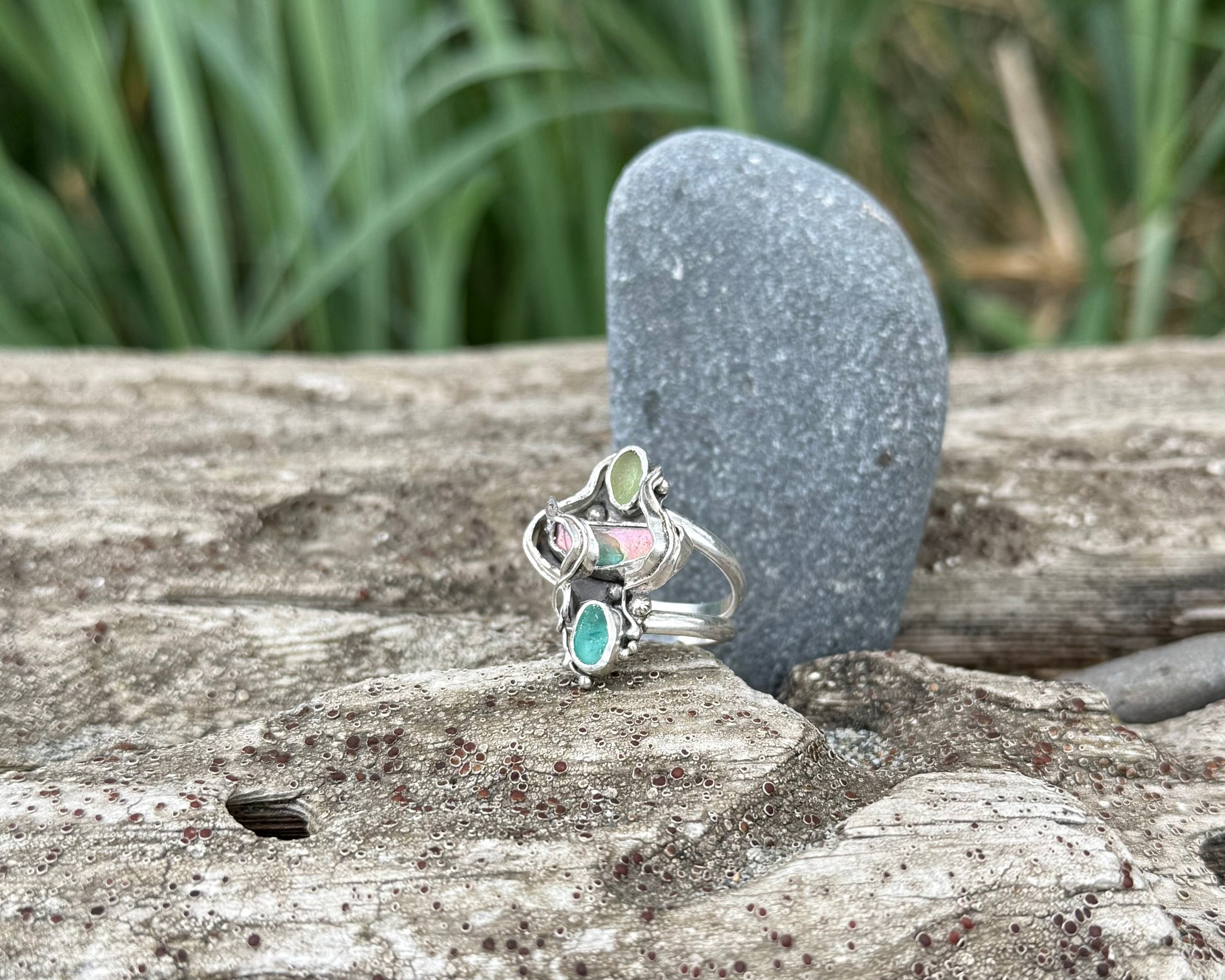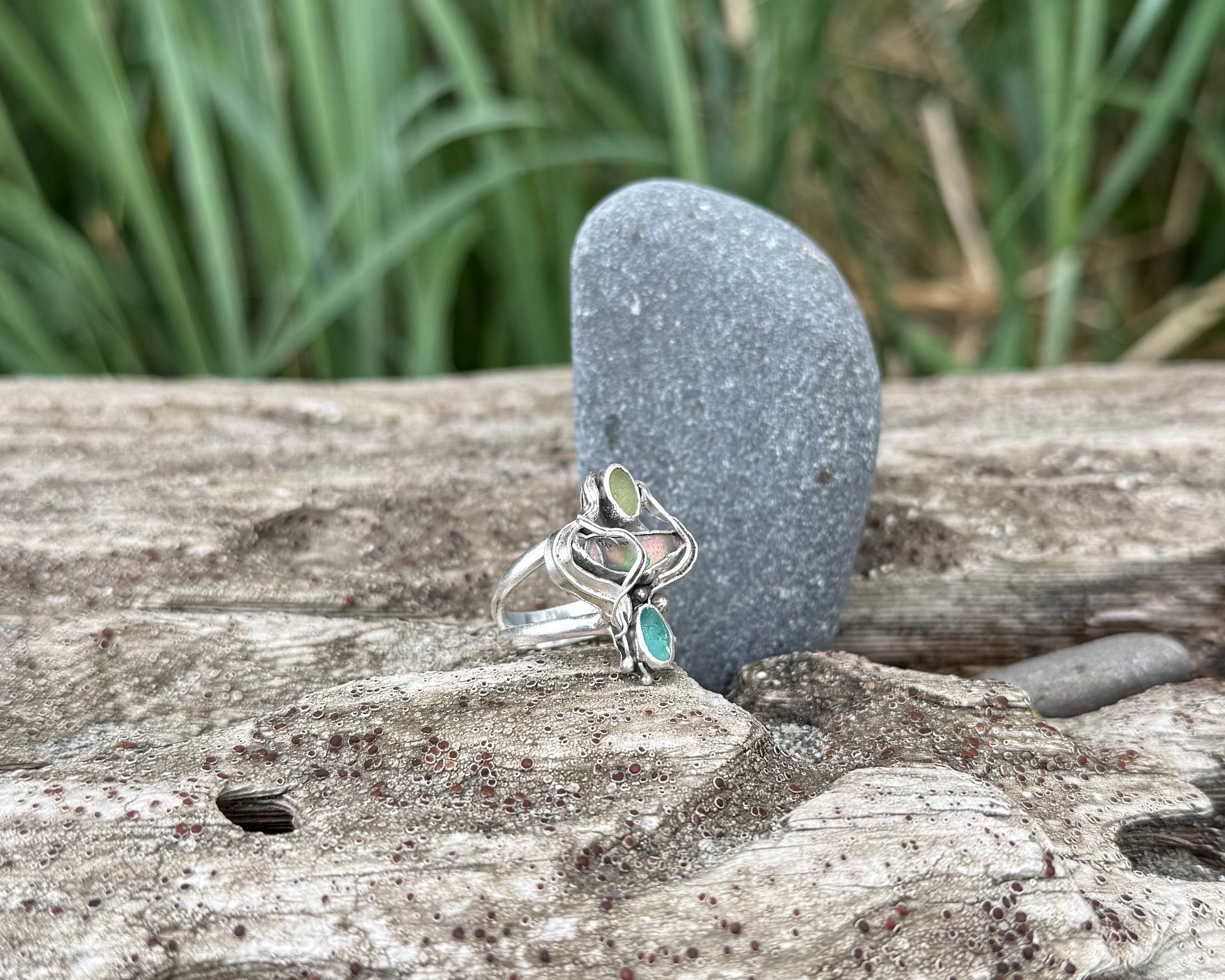 Rare teal and pale green seaglass are nestled with a striking piece of pastel-hued abalone shell, surrounded by hand-fabricated drifting kelp and plenty of hidden barnacles