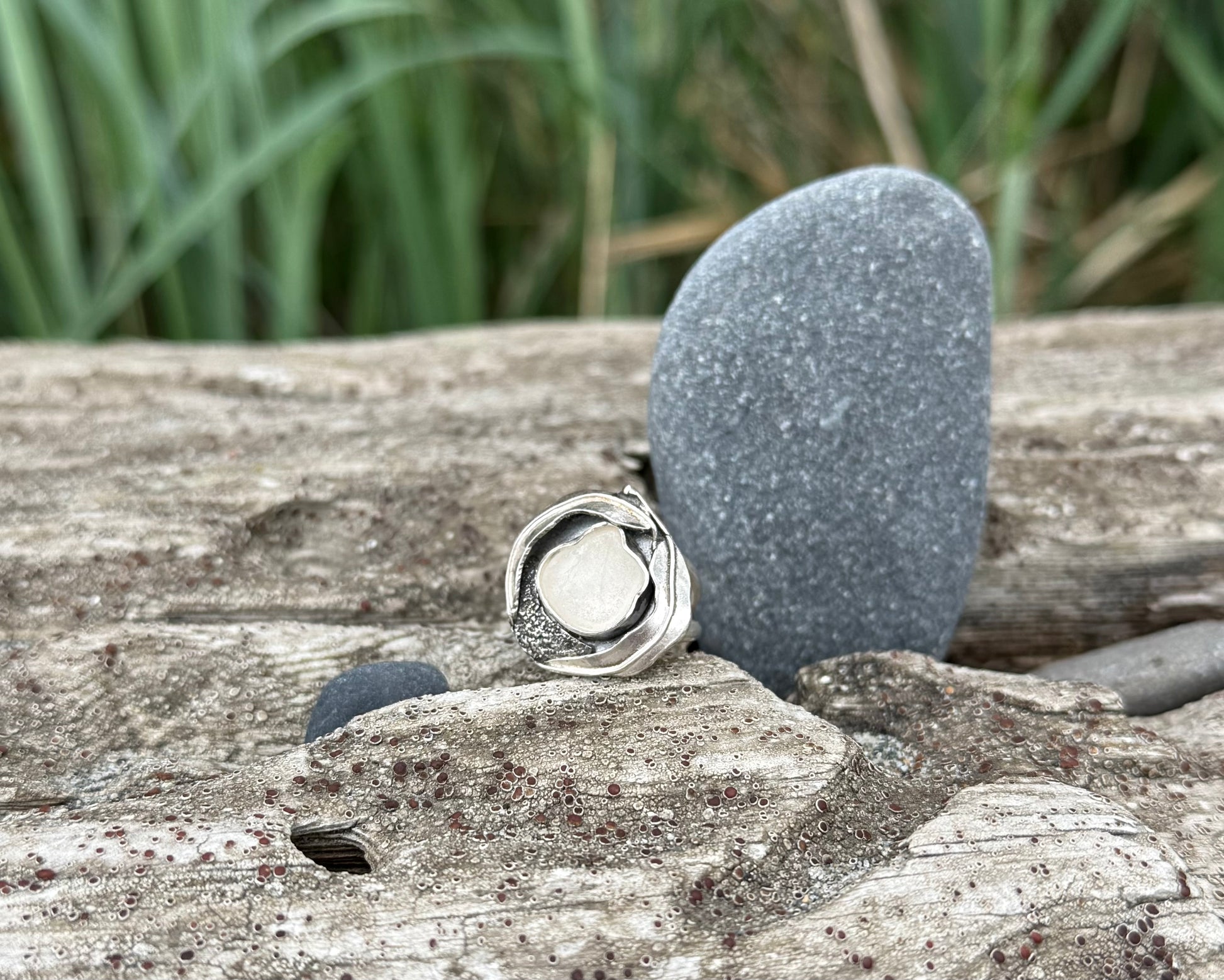White seaglass is nestled within a modern, simple setting reminiscent of a tide pool