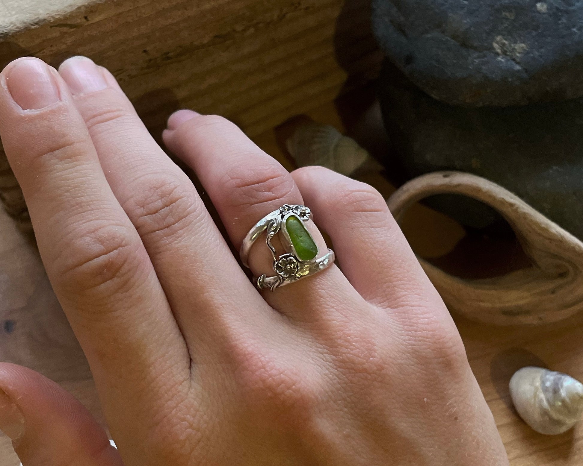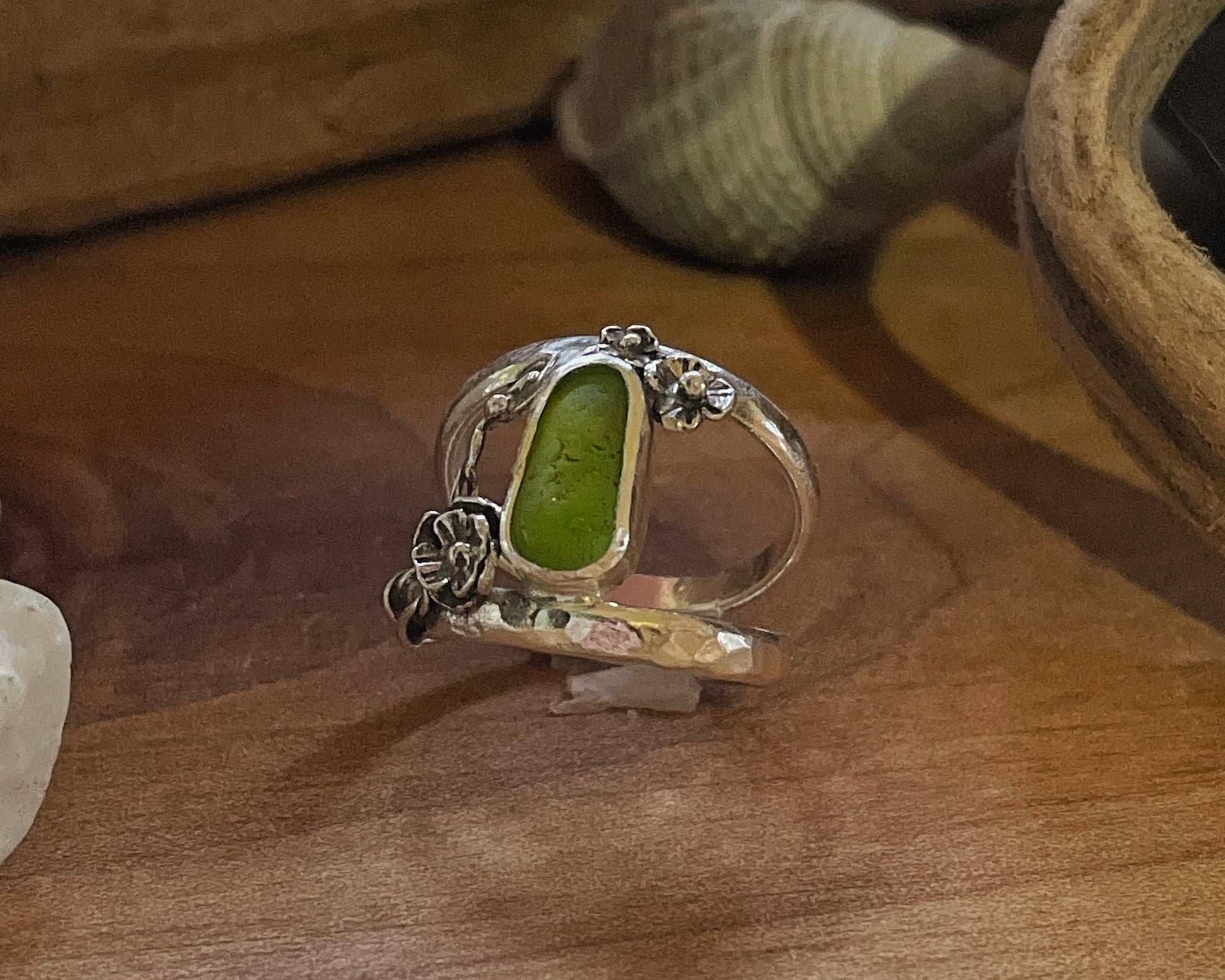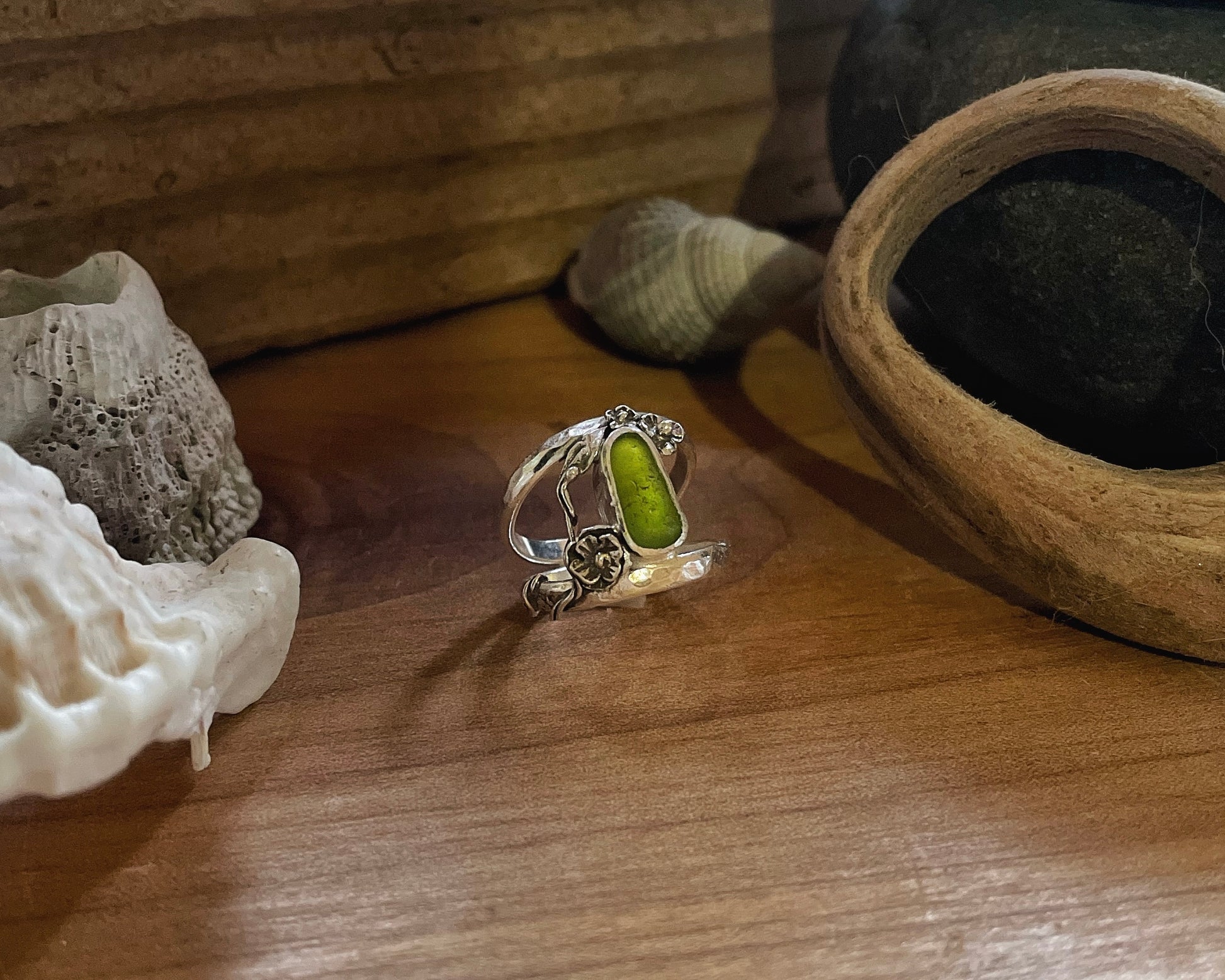 Vibrant lime green sea glass surrounded by tiny hand-fabricated Nootka Rose flowers and leaf.