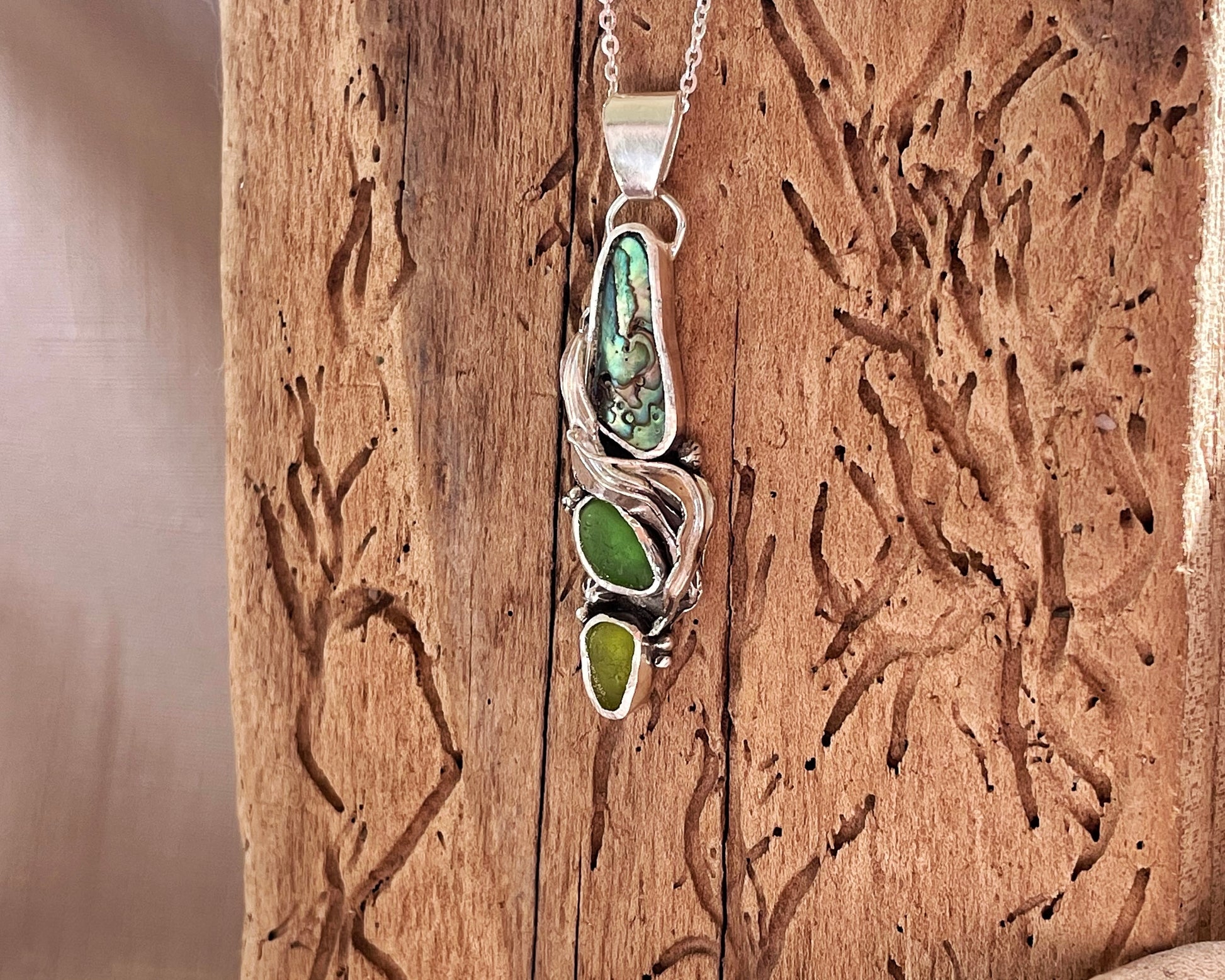 A cascading pendant featuring abalone shell, vibrant green and lime green sea glass, surrounded by free-form flowing "kelp," with plenty of hidden "barnacles" and "bubbles.