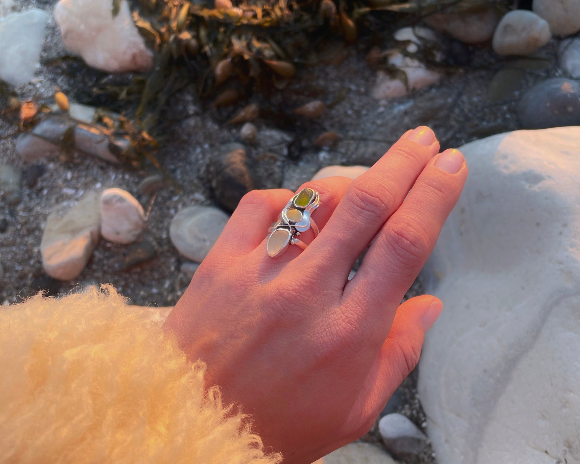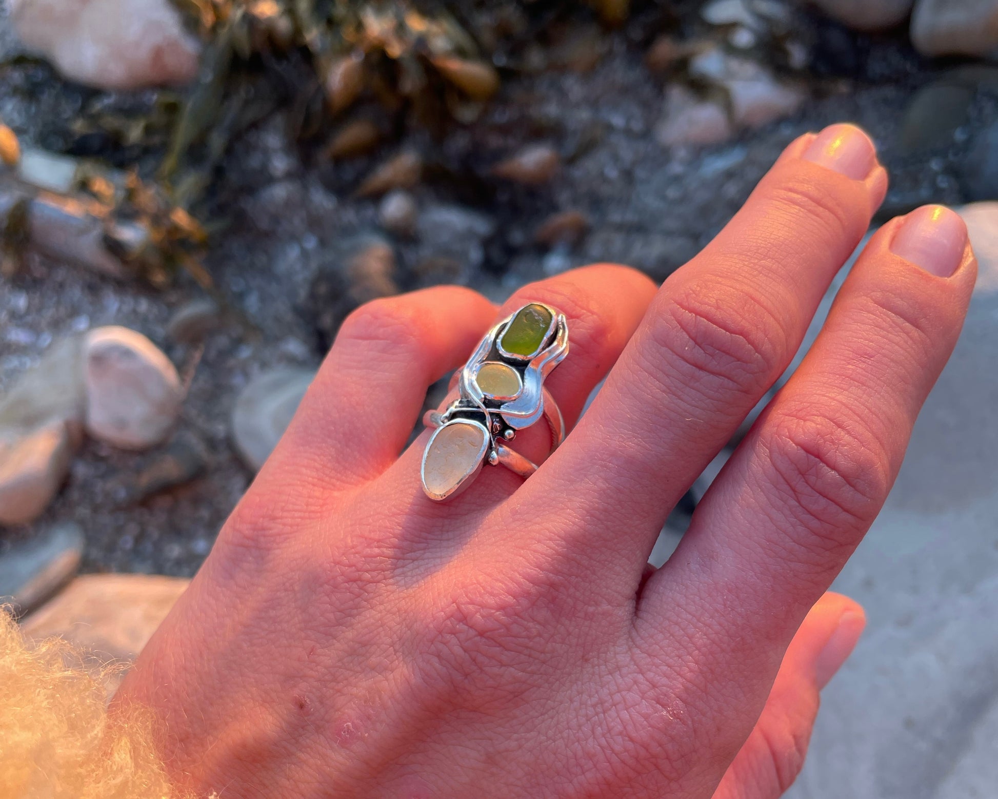 Rare olive green, seafood green, and light golden amber sea glass surrounded by criss-crossing "kelp" with miniature barnacle details.