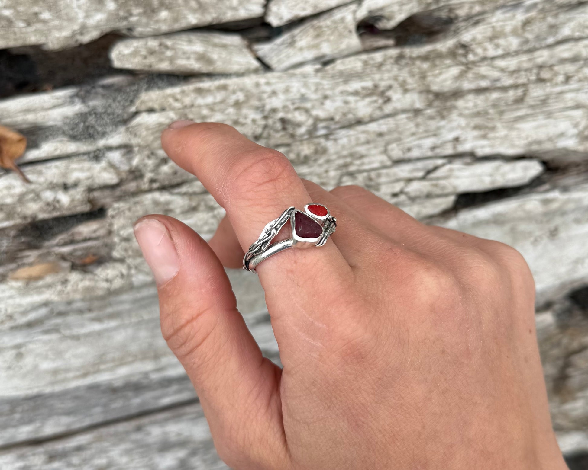 Two different shades of ultra rare red seaglass set amidst mirrored pieces of drifting kelp leaves and bulbs