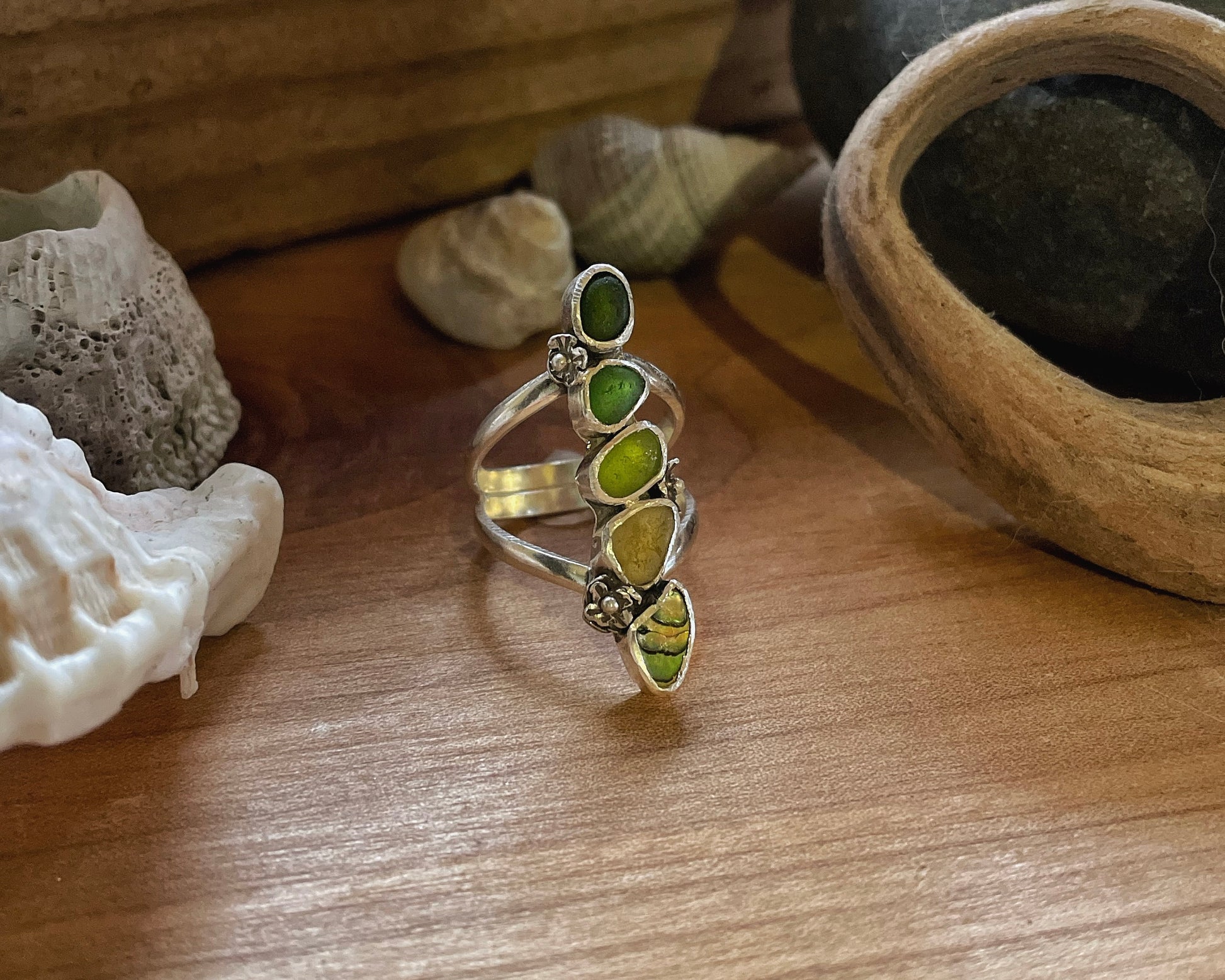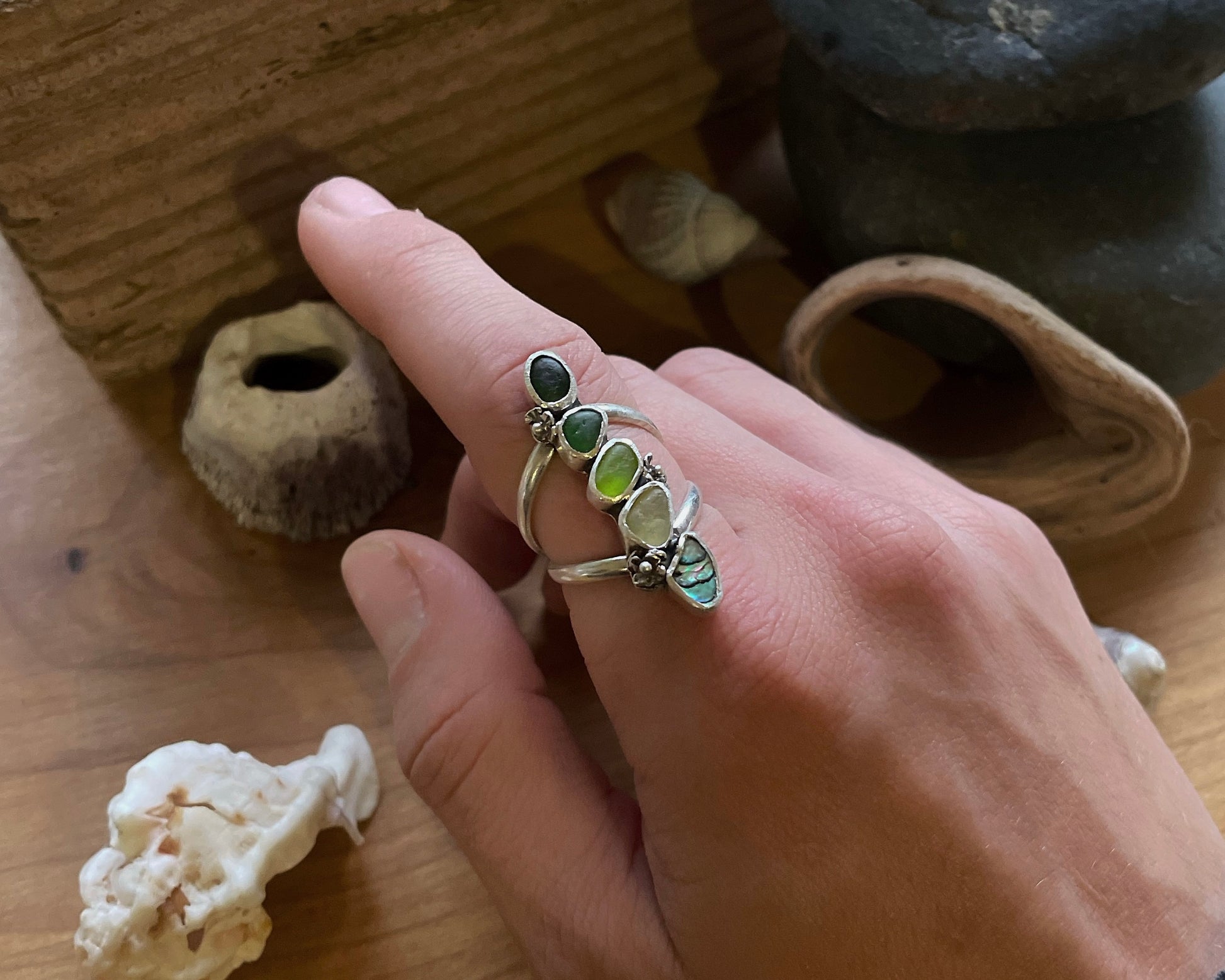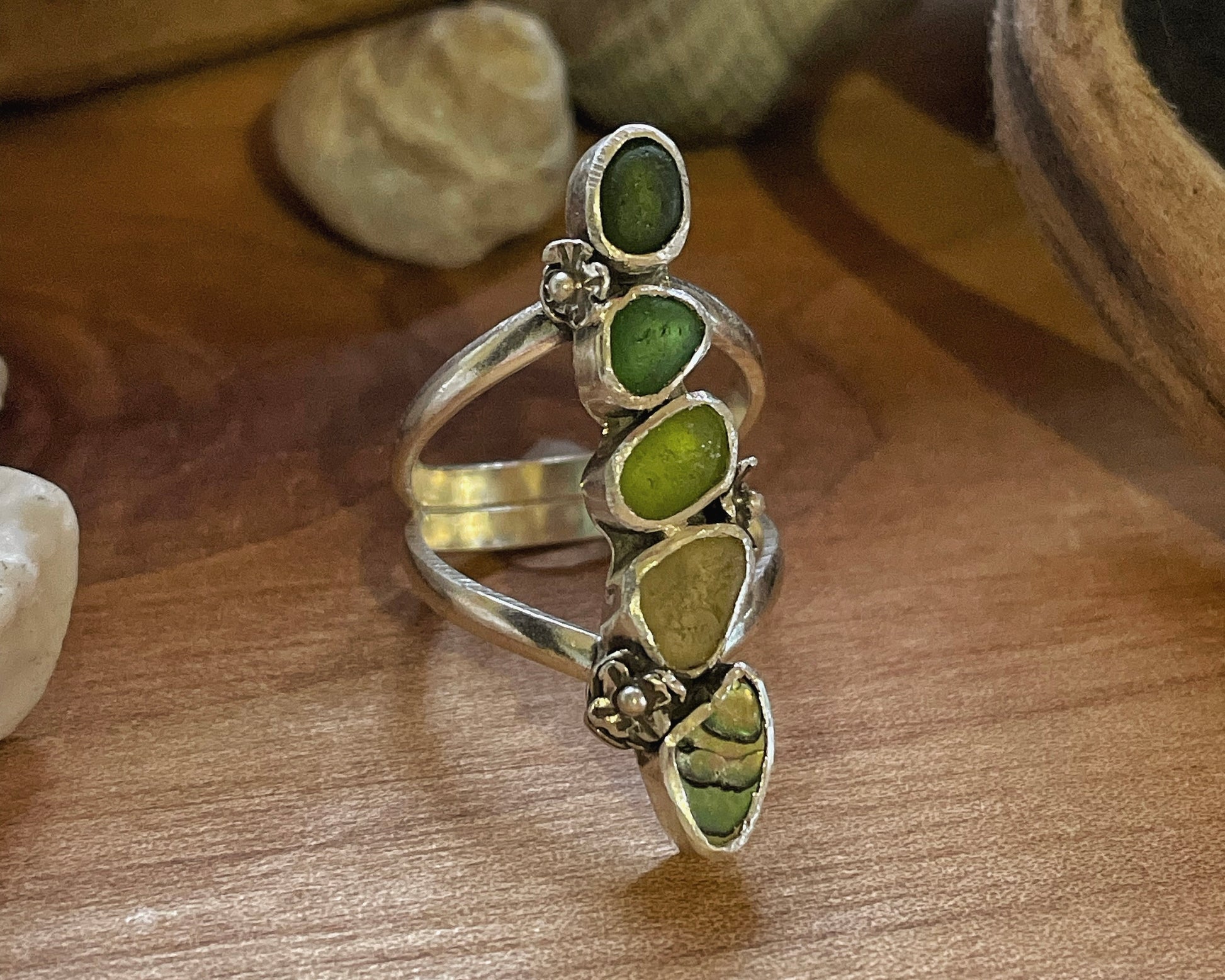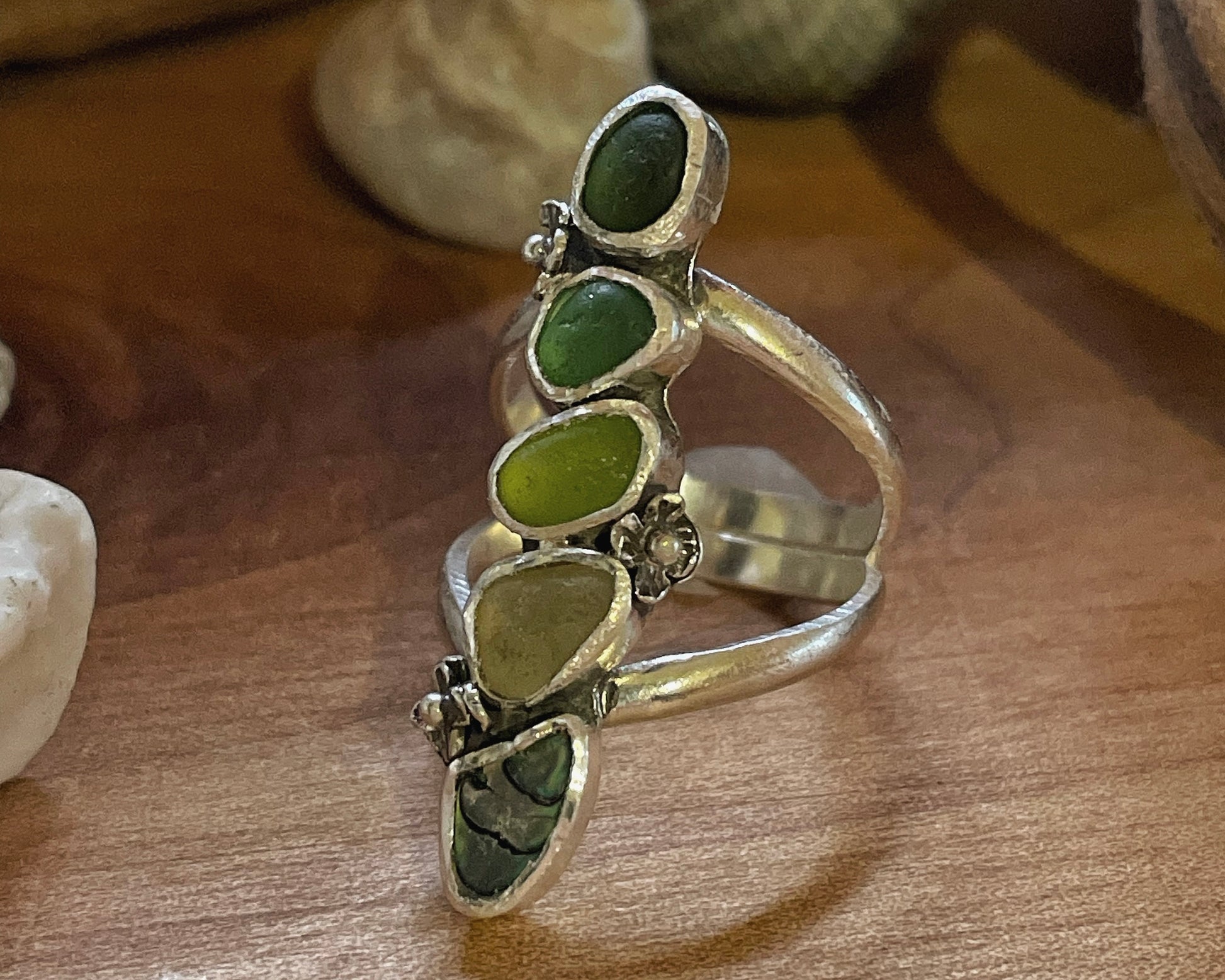 Cascading shades of green sea glass including the rare dark green, olive, lime green, and uranium glass end in a vibrant piece of green-hued abalone shell and are surrounded by tiny, hand-fabricated sterling rose flowers.