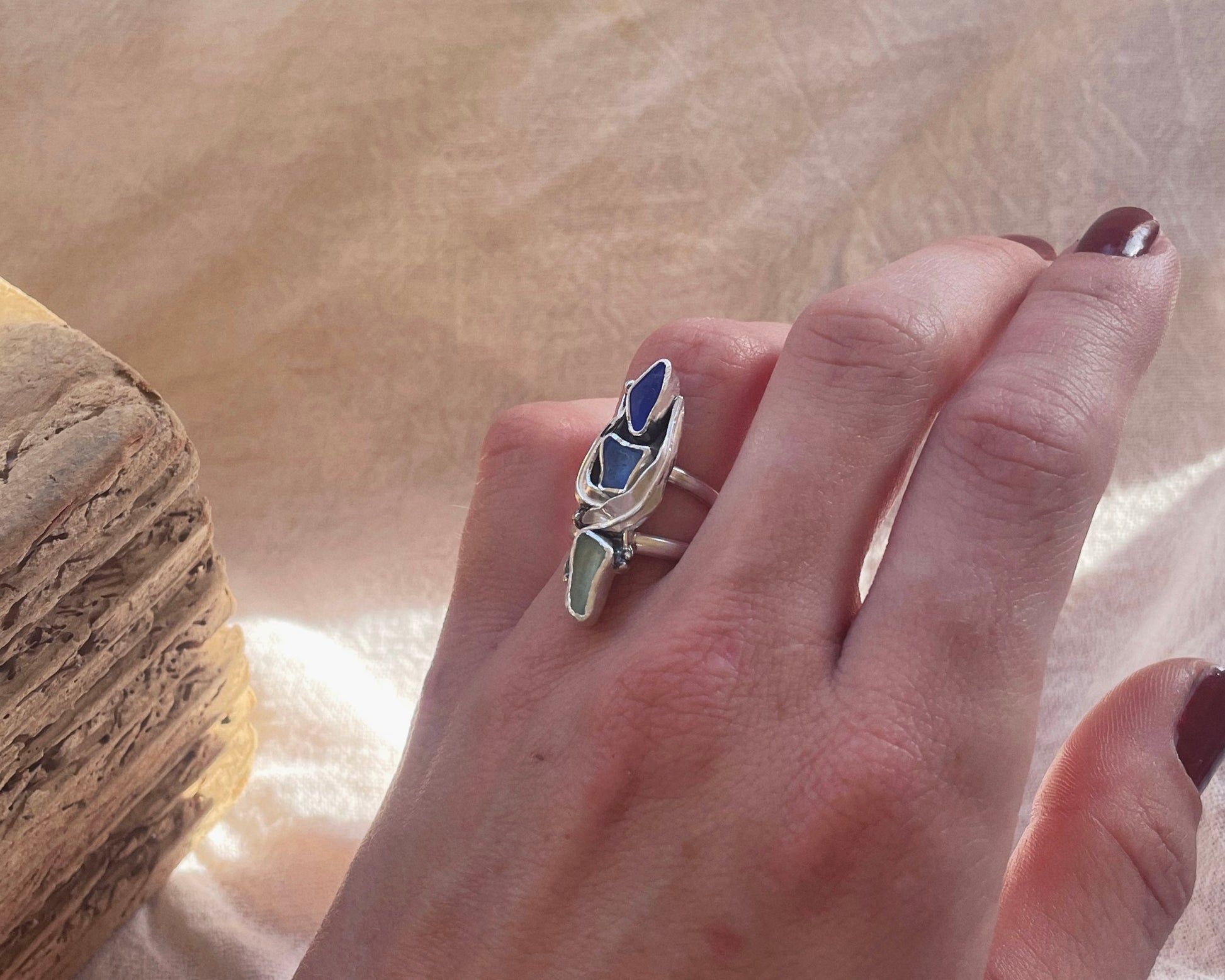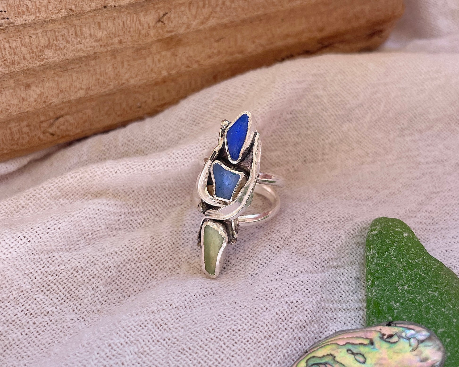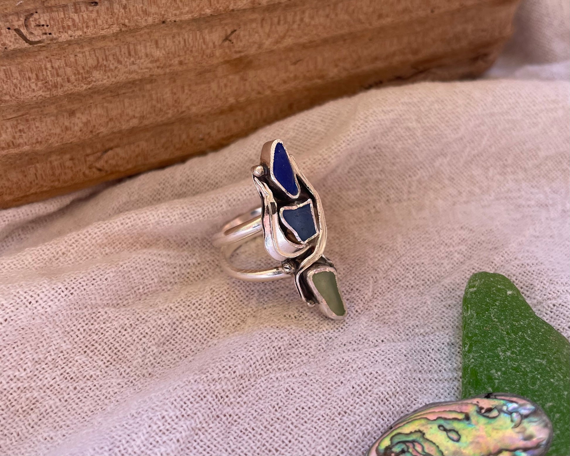 Cascading cobalt blue, periwinkle, and icy blue sea glass surrounded by hand-fabricated sterling silver “kelp.”