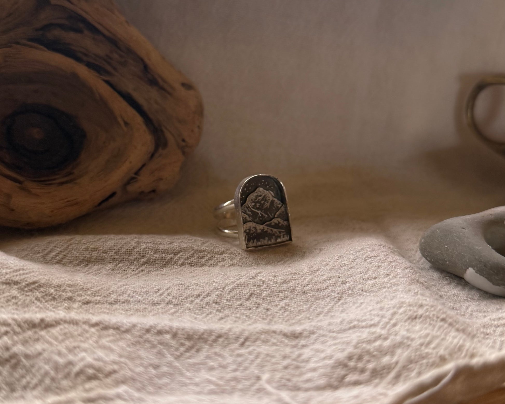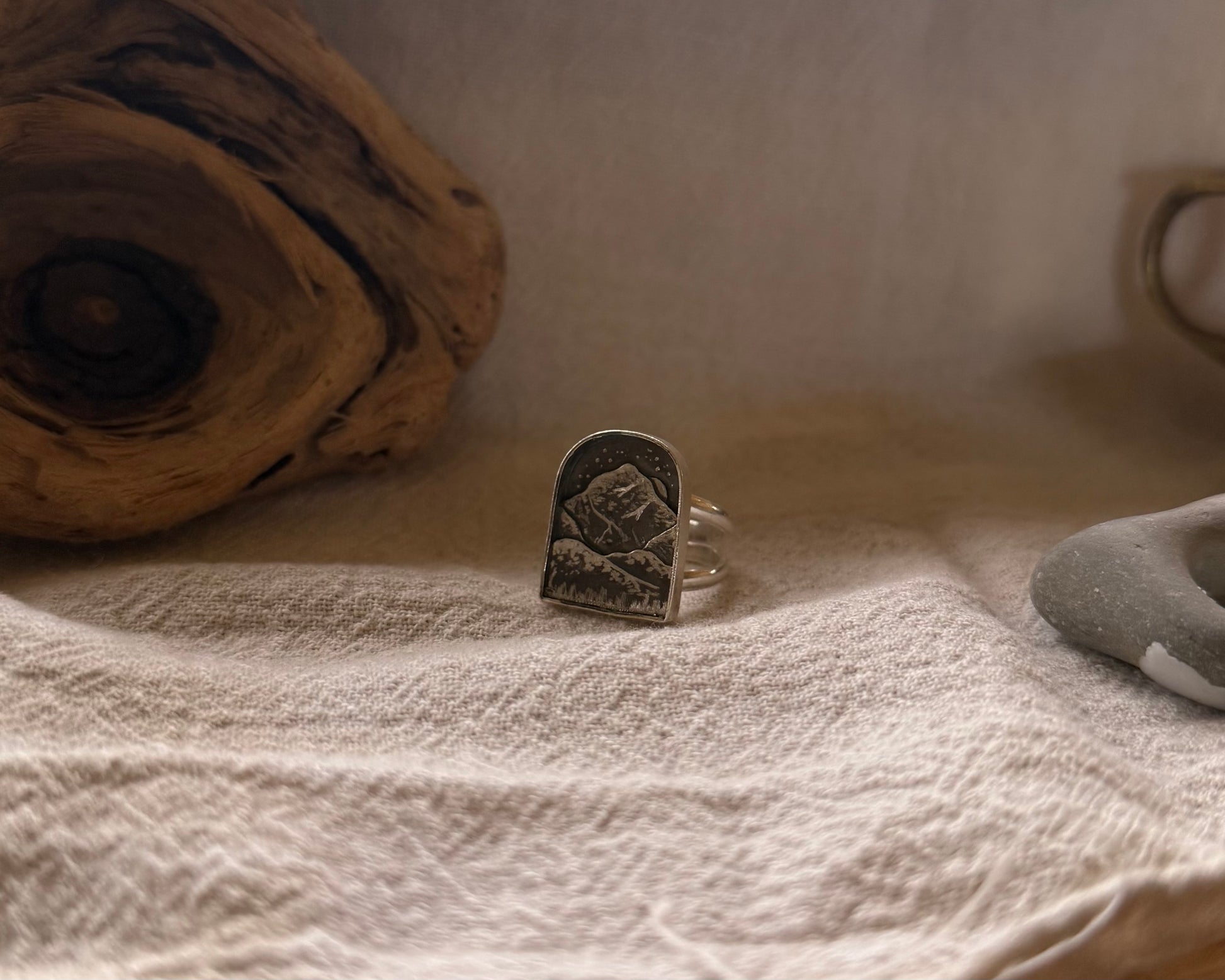 Each vignette ring is hand-fabricated from layered sterling silver and engraved to reveal a landscape only your hands will hold. No casting, no molds, no repetition.