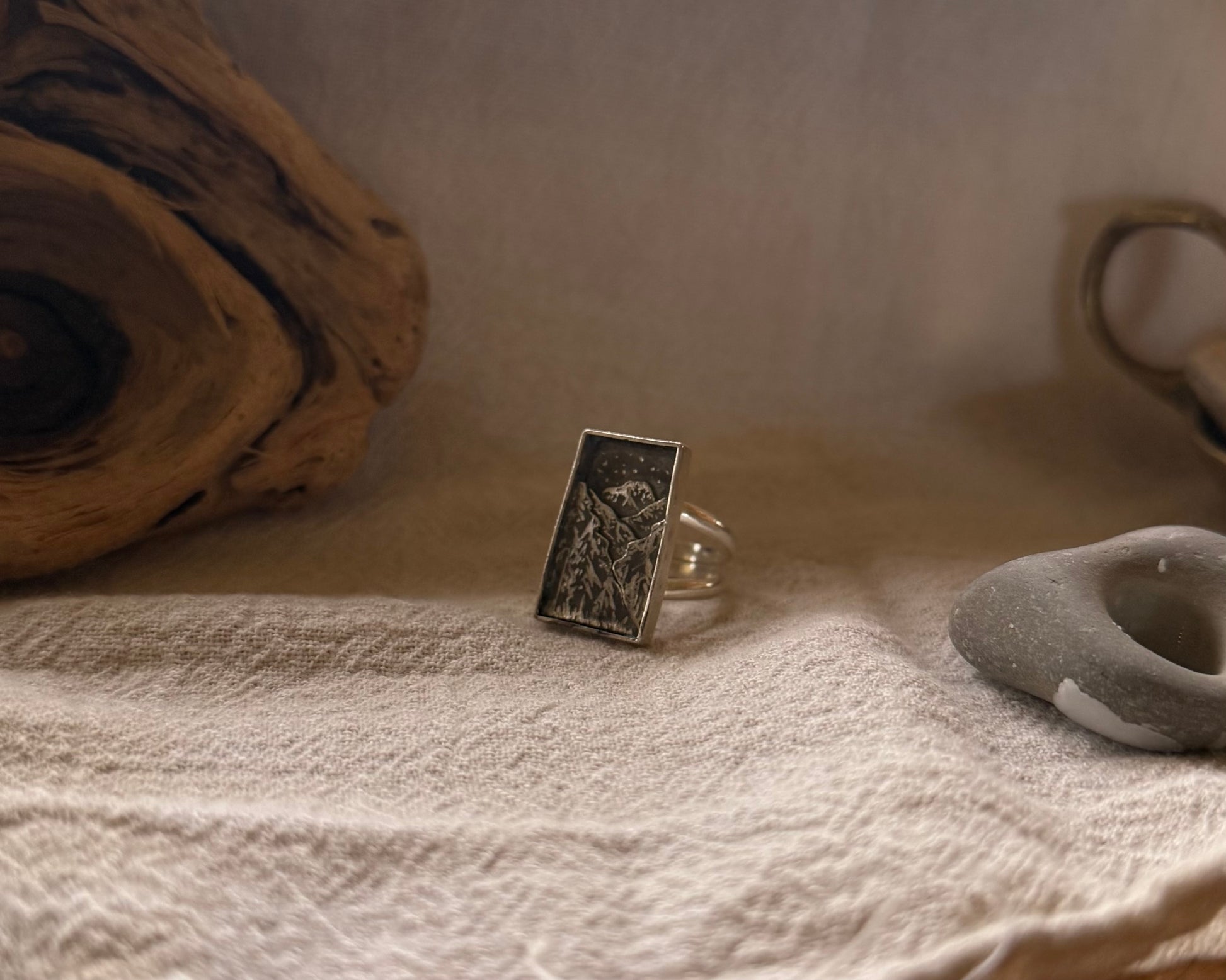 Each vignette ring is hand-fabricated from layered sterling silver and engraved to reveal a landscape only your hands will hold. No casting, no molds, no repetition.