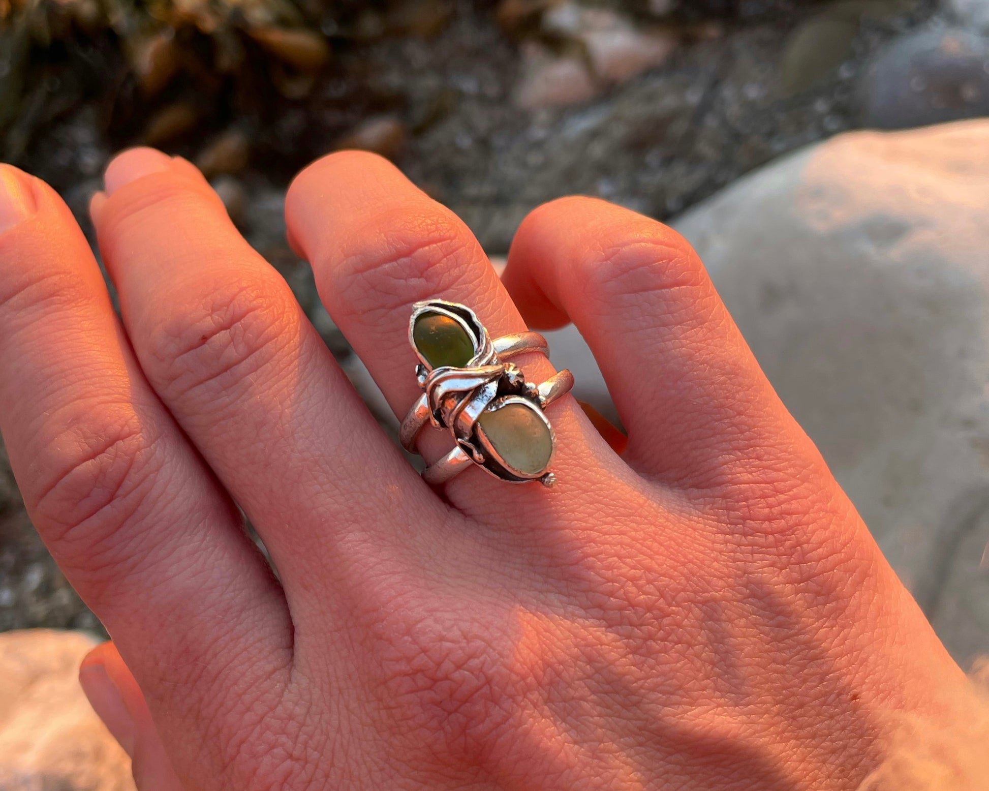Rare olive green and sea foam green sea glass is nestled amongst drifting "kelp" and hidden barnacles.